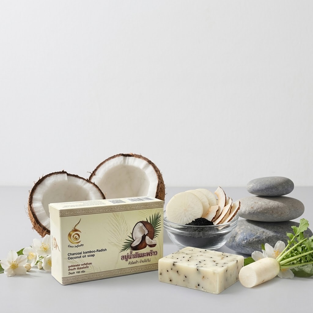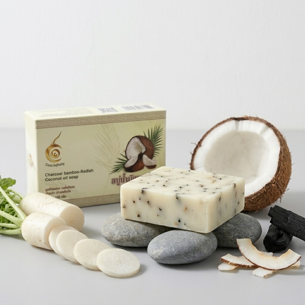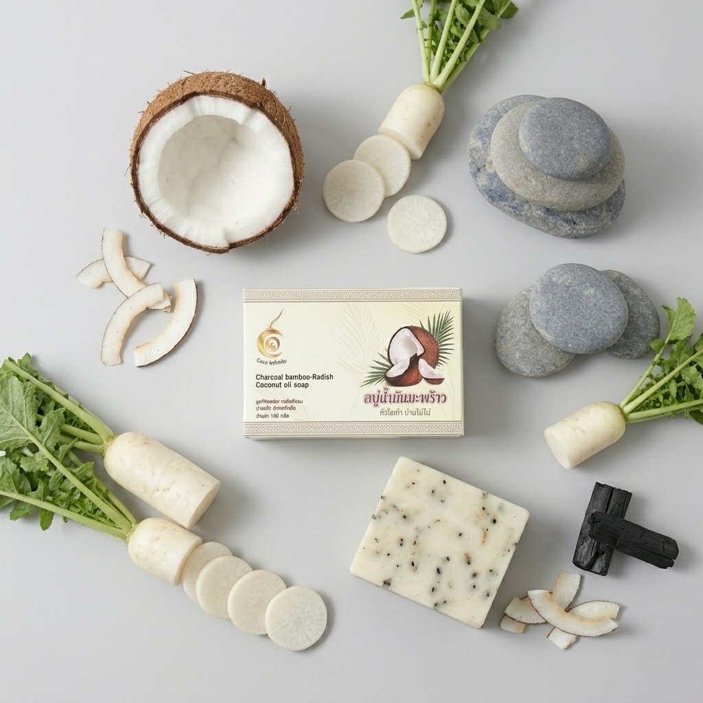 สบู่น้ำมันมะพร้าวหัวไชเท้า ถ่านไม้ไผ่เป็นผลิตภัณฑ์จากวิสาหกิจชุมชน ที่ผสานคุณค่าจากน้ำมันมะพร้าว หัวไชเท้า และถ่านไม้ไผ่ ผ่านกระบวนการผลิตอย่างพิถีพิถัน ช่วยทำความสะอาดผิวอย่างล้ำลึก พร้อมบำรุงผิวให้เนียนนุ่ม และดูสุขภาพดี เหมาะสำหรับการใช้ในชีวิตประจำวัน