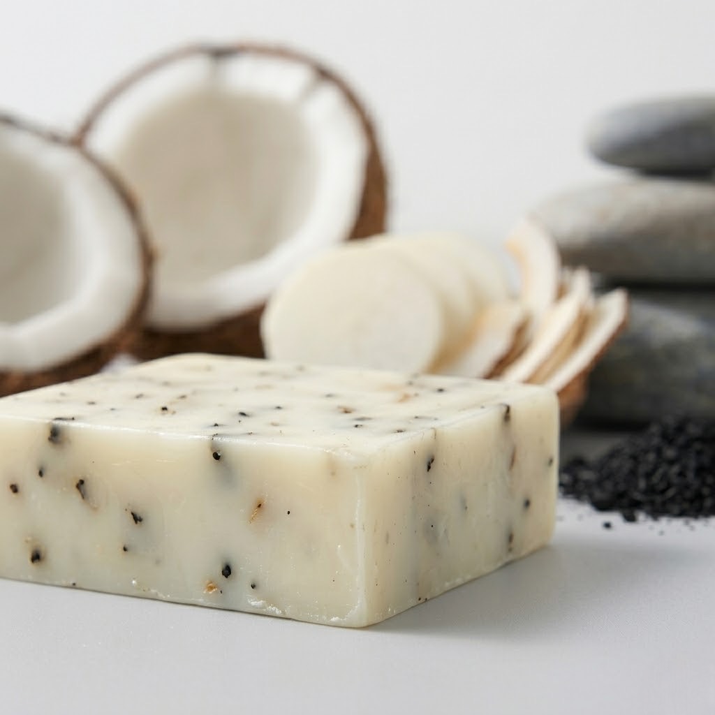 🥥🌿🖤 สบู่น้ำมันมะพร้าวหัวไชเท้า ถ่านไม้ไผ่ (Coconut Oil Soap with Radish & Bamboo Charcoal)